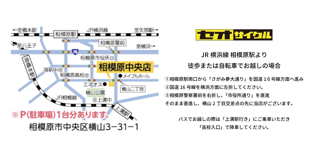 Spring NEW LIFE春の新生活を応援します新しい季節新しい自転車で進みだそう 修理・点検について当店にて修理・点検をご利用の際はご一読お願いいたします当店は予約制ではありません。そのままお持ち込みください。混雑状況によってはお預かりになる場合がございます。時間に余裕をもってお持ち込みください。 現在の待ち時間目安修理・点検など現在の待ち時間状況がご確認いただけます 当店について・当店コンセプト・店長について 新車購入について・新車ご購入についてのご案内・防犯登録について・当店おすすめプラン 支払い方法当店でご利用いただける支払方法をご確認いただけます 営業日と臨時休業のご案内営業時間OPEN 10:00 CLOSE19:00定休日 毎週水曜日臨時休業日に関してはご確認ください キャンペーン・現在実施中のキャンペーン・お知らせ 取り扱いブランド自転車やパーツなど当店で取り扱いのあるブランドを掲載しております 2026年3月21日で5周年を迎えます 皆様にご利用いただき5周年を迎える事ができました今後ともスタッフ一同、精進してまいります引き続きご愛顧のほど、よろしくお願い申し上げます セオサイクル相模原中央店 SHOP CONCEPT SHOP MASTER SHOP CONCEPT SHOP Instagram RECRUIT SNS BRAND BICYCLE BICYCLE PARTS REPAIR REPAIR MAINTENANCE ESTIMATE BICYCLE BUY BUY PAYMENT DISPOSAL REGISTRATION CAMPAIGN SEASON RECOMMEND BESV PANASONIC XEALT PANASONIC ViVi MERIDA Muc-off ACCESS PARKING WAIT TIME NOW SHOP BLOG