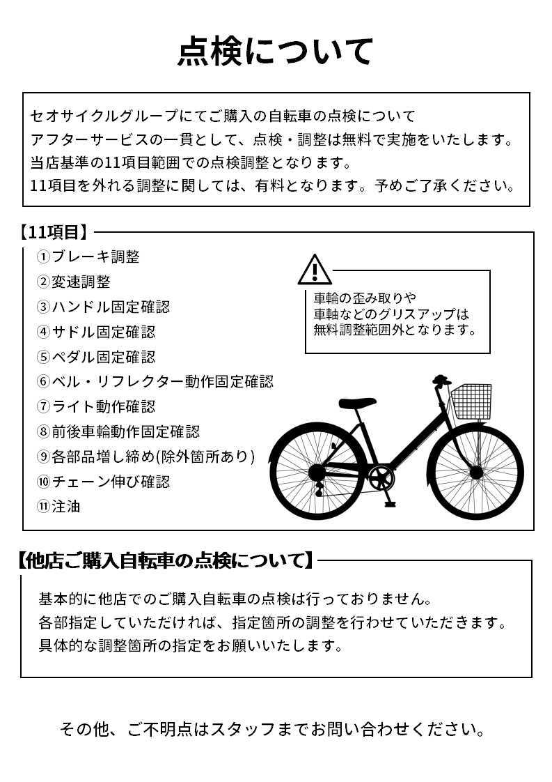 セオサイクルではお買い上げいただいた自転車が購入後も安全に、末永く安心してご利用頂けるように無料点検サービスを行っています。