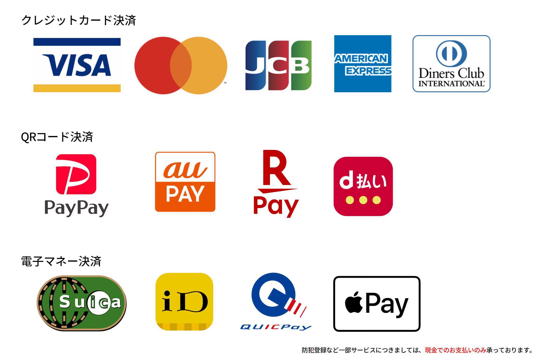 当店では、現金でのお支払い以外に、以下の決済方法がご利用できます。