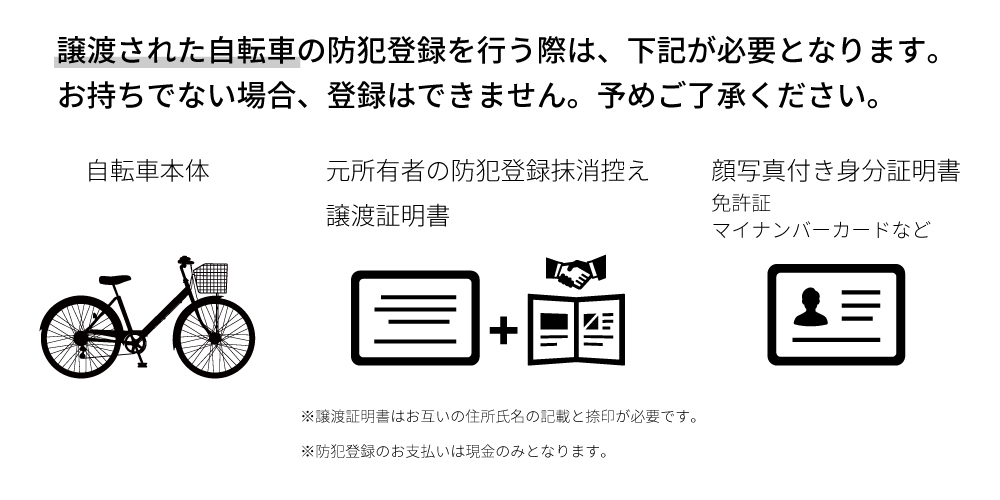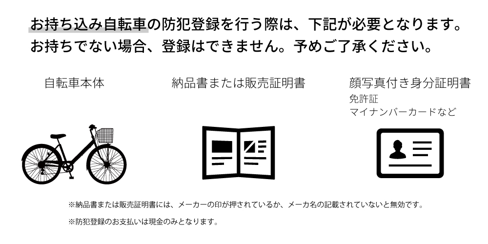 自転車ご購入時は、身分証明書等は不要です。また、お支払い方法は現金のみとなります。