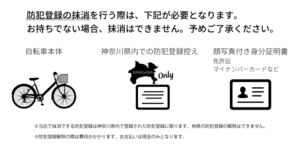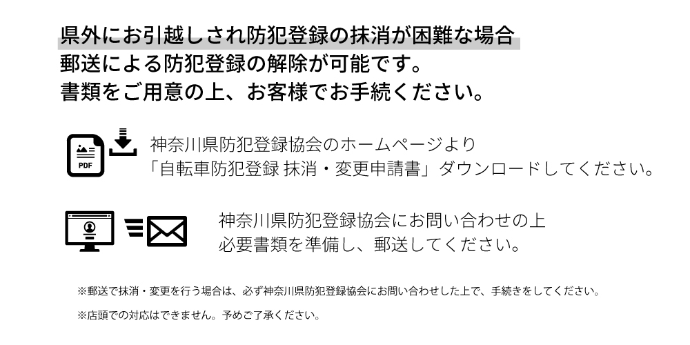 神奈川県内の防犯登録所での防犯登録解除の手続きが困難な場合は、神奈川県防犯登録協会にお問い合わせの上、郵送での手続きになります。