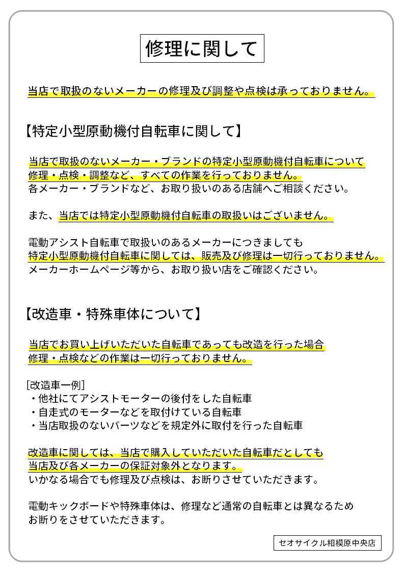 原則、当店でお買い上げ頂いた自転車のみ承っております。お買い上げ頂いた店舗にご相談ください。
