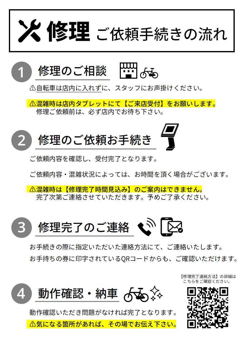 ※予約を承っていないため、お電話で修理完了時刻などをお問い合わせいただいてもお答えできかねます。ご了承ください。