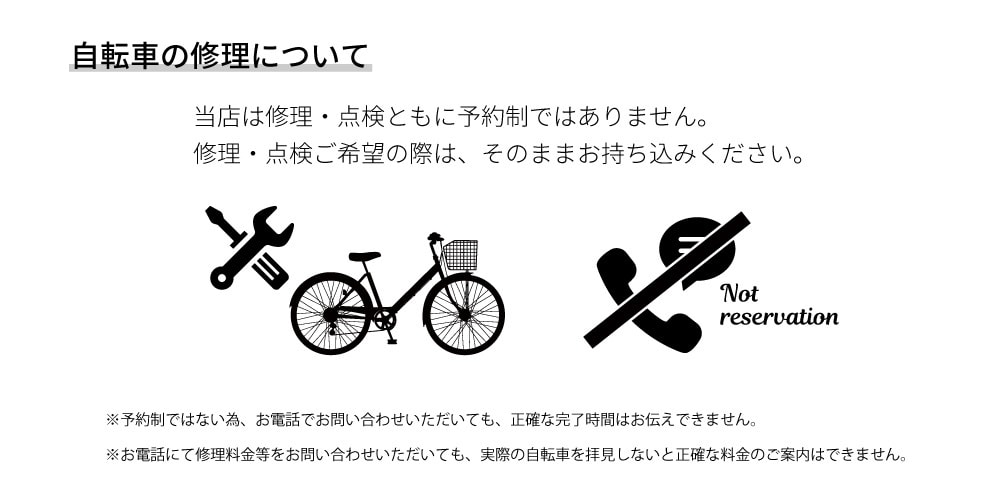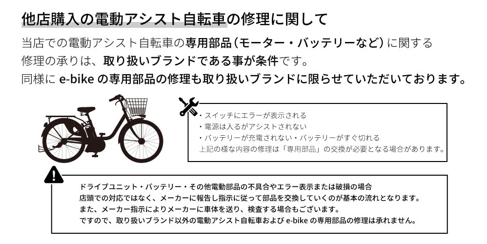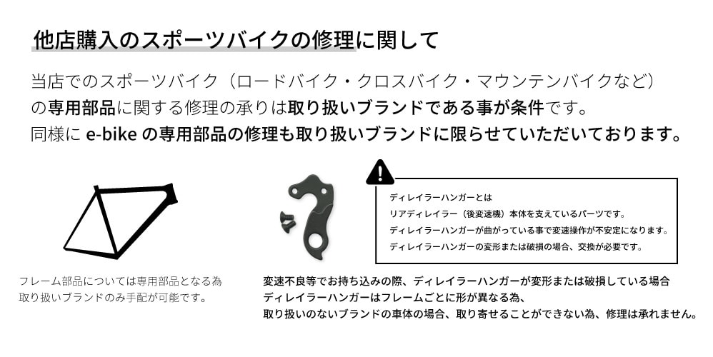 ※セオサイクルのグループ店で購入された自転車でも、当店で取扱いのないメーカーの場合、車体に関わる修理及び部品の取り寄せはできませんので、ご購入いただいた店舗へご相談をお願いいたします。
